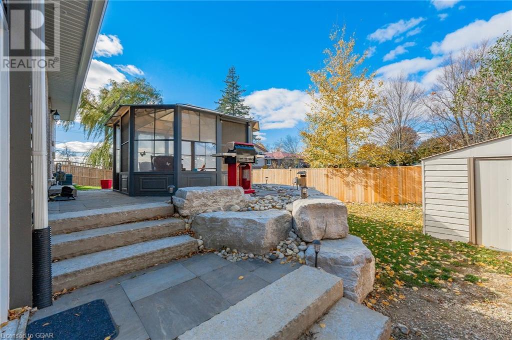 Welcome to the beautiful Town of Elora! It is with great pleasure we bring to market this four bedroom, two bathroom 4 level side-split with over 2200 sqft of amazing living space. The open concept kitchen to dining room featuring a granite island, natural wood floors and space enough for 12 around the harvest Christmas table with ease. Three generous sized bedrooms plus bath on the upper level and a fourth bedroom on the lower level has plenty of room for everyone to have their own space. The lower family room floods with natural light through the bank of bay windows plus a fireplace option to make those cozy up nights a cinch. Hey and let's talk about the basement rec room specifically built for that perfect pool shot or serving friends at the live edge bar during the leaf game. Pinball niche is just perfect for the collector machine or featured collection. Walk up from there to the bonus great room to increase that space to WOW! Outside living on your wish list WELL have we got the space for you, fully fenced with rockery patio crowned with a gazebo for all year round covered barbecuing and yes the hot tub is ready to go for star gazing or just melt the days stresses away. All this on a huge lot at the start of Elora. Come have a look at what could be your new home. $999,000.00 make an offer and let's deal! (id:6909)